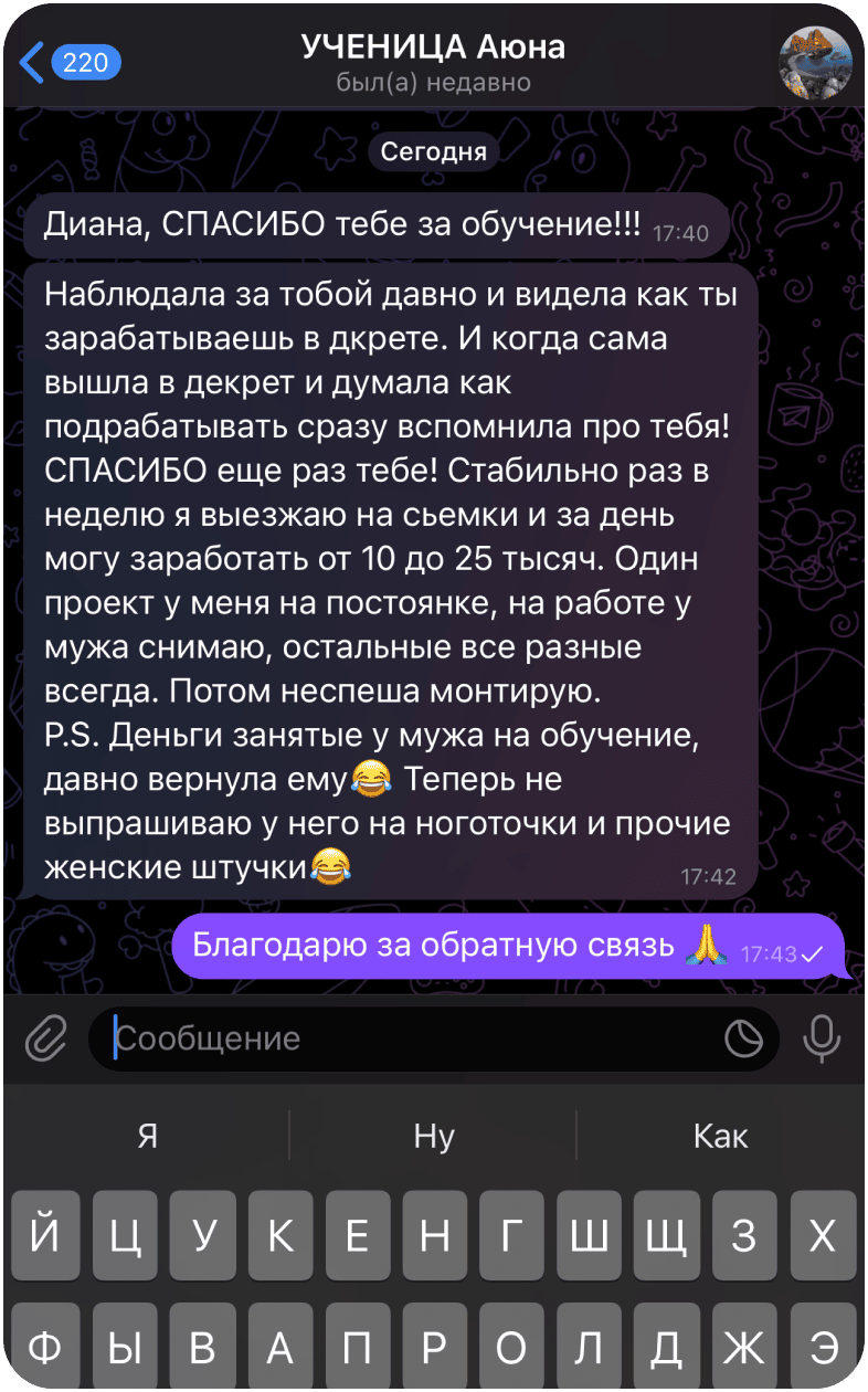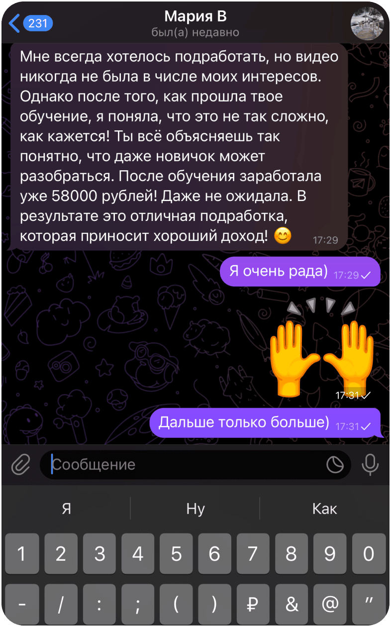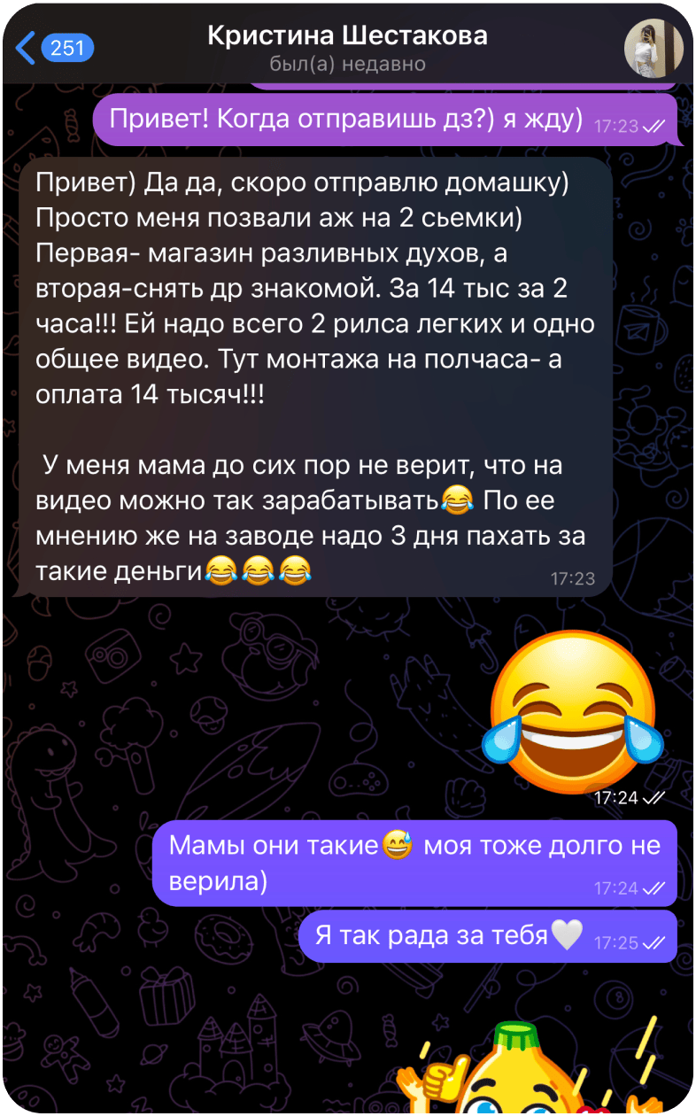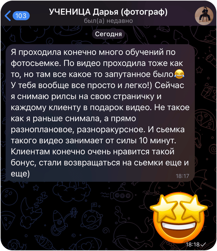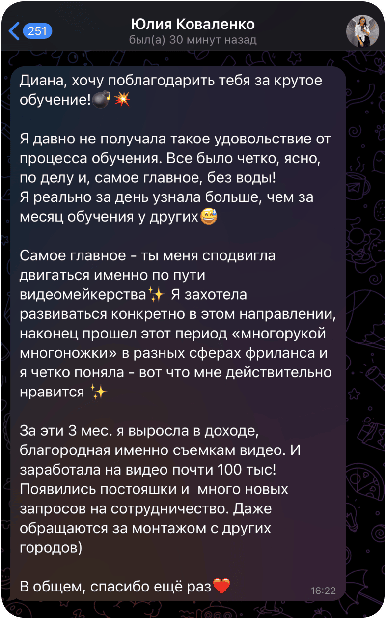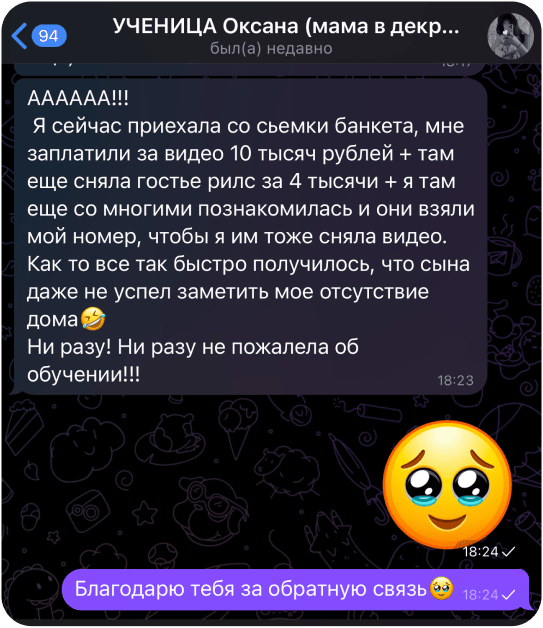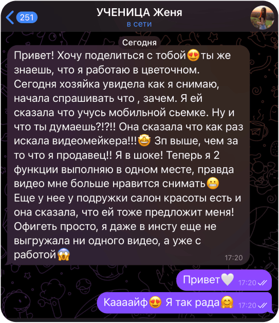 Вы овладели навыками мобильной съёмки и монтажа, начали получать заказы на фрилансе и зарабатывать дополнительно в свободном графике из любой точки мира. Либо устроились в компанию и получаете стабильную зарплату